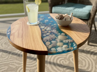 Table d’appoint bois et résine – Design galet, fabrication artisanale