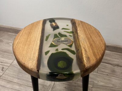 Bout de canapé en bois et résine avec bouteille de champagne