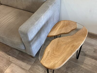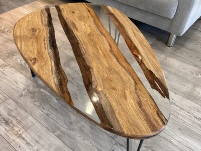 Table basse en bois et résine transparente – Forme organique