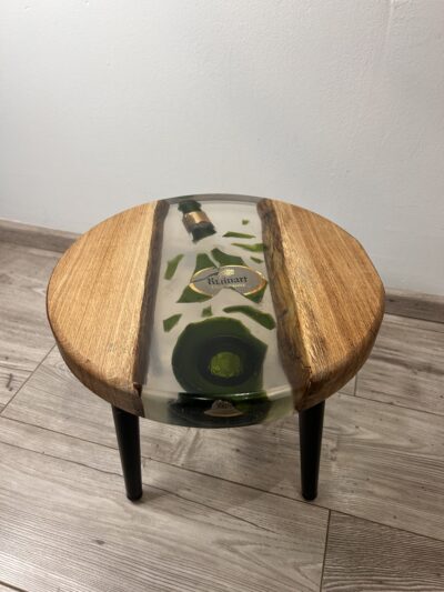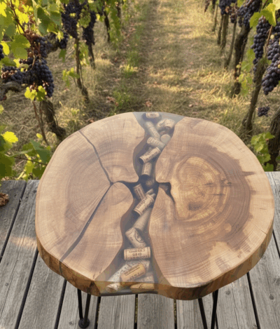 Guéridon en bois avec rivière d’époxy et de bouchons de lièges