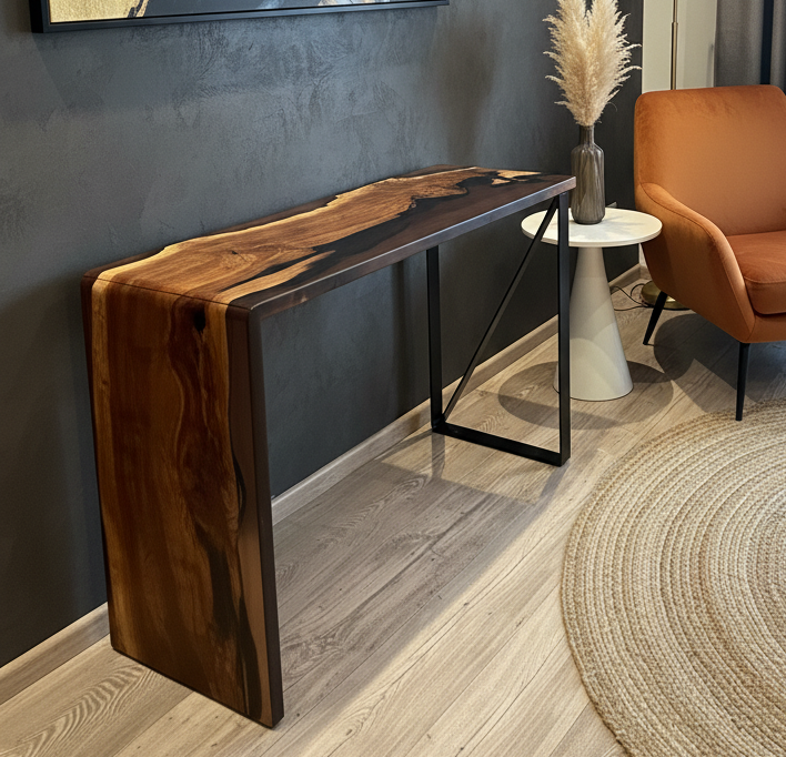 Sublimez votre entrée ou votre salon avec cette console d’exception, véritable pièce d’artisanat moderne. Ce meuble se distingue par son plateau en bois massif au veinage profond, magnifié par une insertion fluide de résine époxy noire fumée.