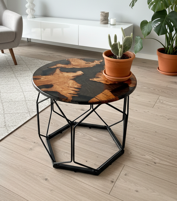 - La petite table arbore une résine noire profonde et fumée, mettant en lumière les tons chauds et ambrés du bois.