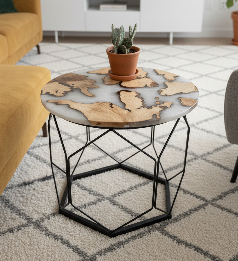 - La grande table utilise une résine blanc givré / opale, créant un aspect aérien et lumineux qui sublime les détails naturels de l’écorce.
