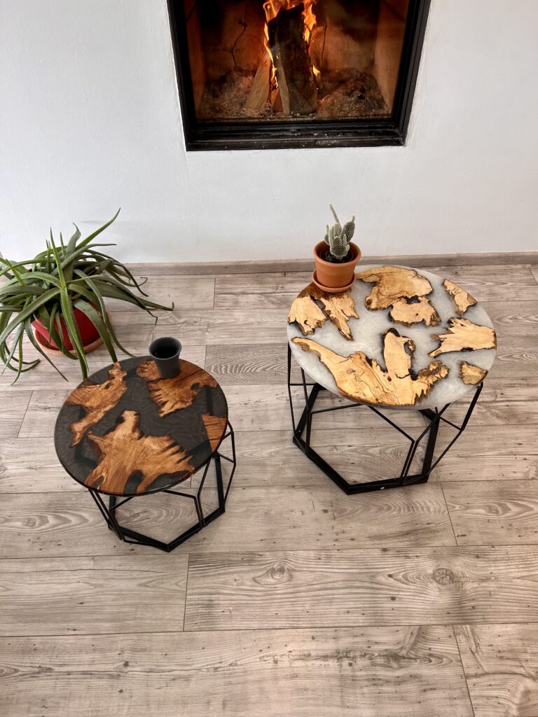 - Détails Naturels : Contrairement aux plateaux unis, ces tables préservent le côté sauvage du bois, avec des inclusions visibles sur 360°.