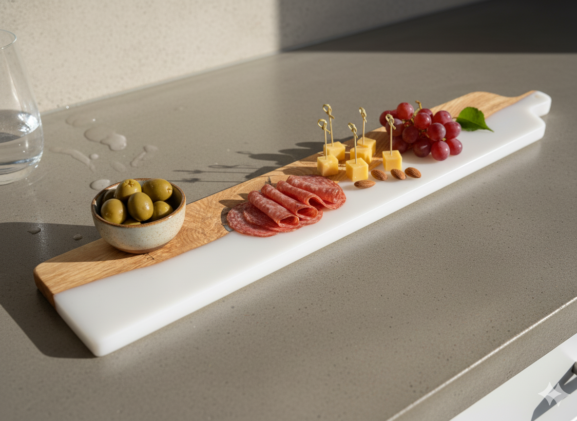 Que ce soit pour un apéritif entre amis, un dîner en famille ou une réception élégante, la planche apéro en olivier et résine sera la pièce maîtresse de votre table, ajoutant une note de sophistication et de convivialité à tous vos moments gourmands. N’hésitez pas à combiner cette planche avec d’autres accessoires en bois et en résine pour créer une ambiance harmonieuse et chaleureuse.