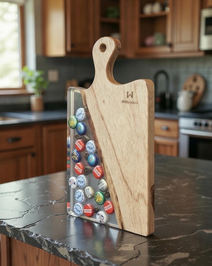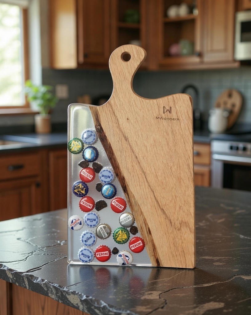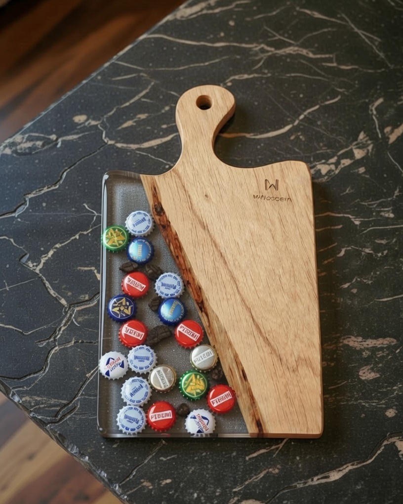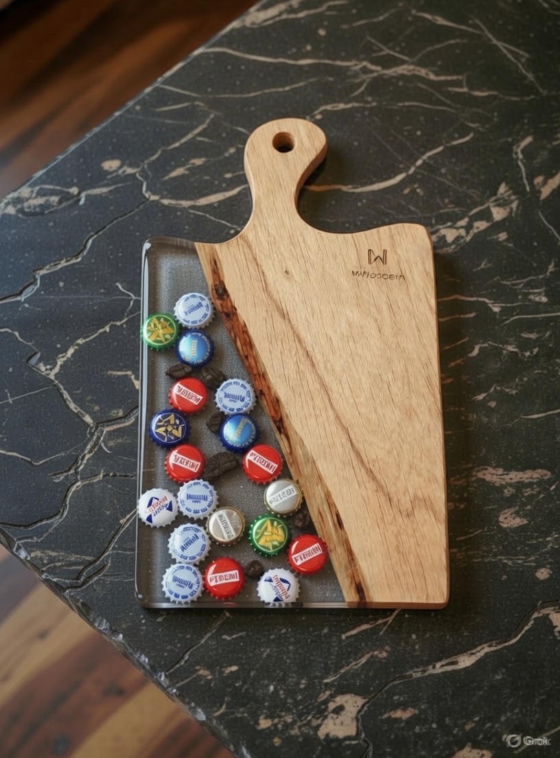 Apportez une touche originale et authentique à vos apéritifs avec cette planche apéritive artisanale en bois massif et résine époxy, intégrant de véritables capsules de bière soigneusement incrustées à la main.