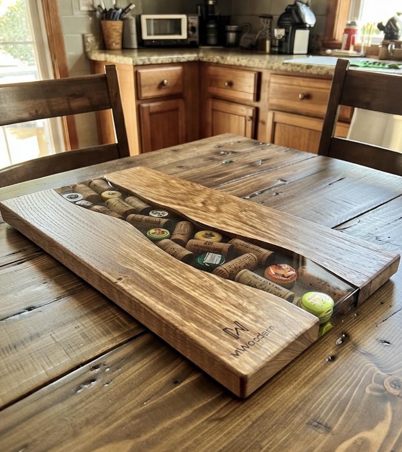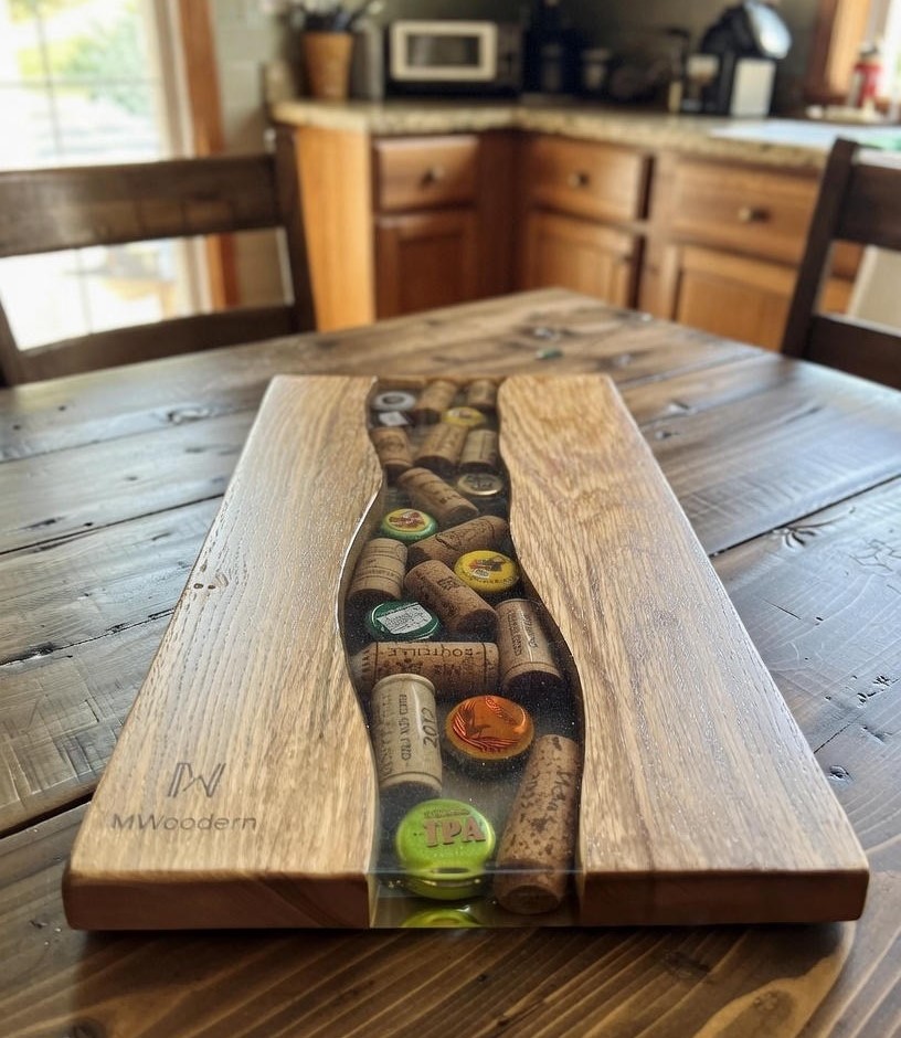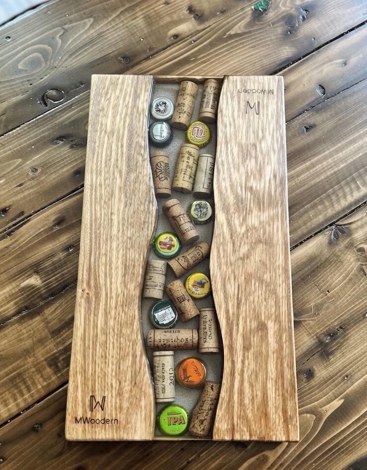 Cette planche décorative en bois massif et résine époxy met en valeur de véritables bouchons de vin et capsules, figés dans une résine transparente pour un rendu à la fois authentique, graphique et chaleureux.