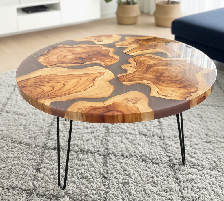Le tout est figé dans une résine époxy ambre foncé, polie pour obtenir un fini miroir. Cette teinte profonde apporte une chaleur incomparable à votre salon, tout en créant un jeu de transparence captivant selon l’éclairage. Son format rond et ses pieds épingles (hairpin legs) noirs lui confèrent une silhouette moderne et légère qui s’intègre parfaitement dans un intérieur cosy ou contemporain.