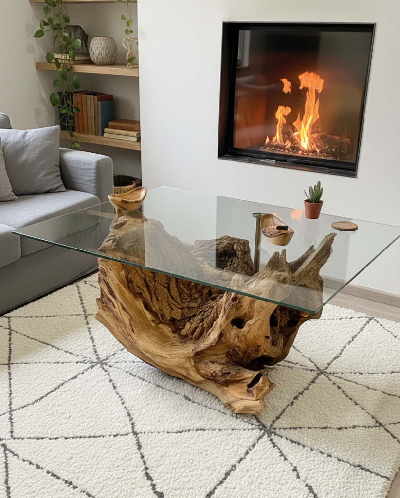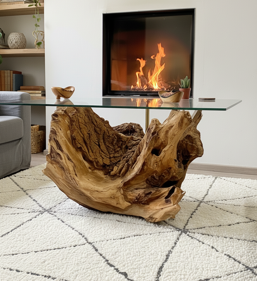 Pour ne rien cacher de cette structure fascinante, nous avons choisi un plateau en verre trempé ultra-clair. Cette transparence totale permet d’admirer les cavités, les écorces et le veinage complexe du bois sous tous les angles, tout en offrant une surface fonctionnelle et aérienne. C’est un meuble qui semble flotter dans l’espace, apportant une âme puissante et une chaleur naturelle à votre salon.
