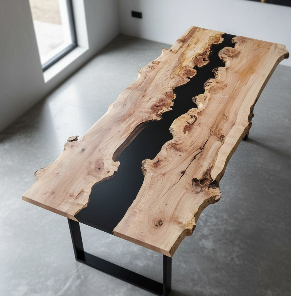 Son design « River Table » est ici poussé à son paroxysme : le contraste chromatique met en lumière chaque détail de l’écorce et chaque courbe du veinage. Soutenue par un piétement en U en acier noir mat, cette table impose sa présence et devient instantanément le cœur de votre décoration intérieure.