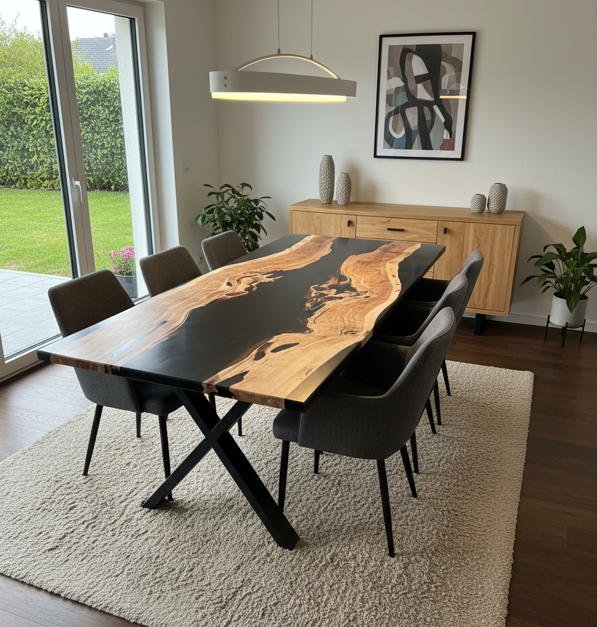 La résine noire traverse la table comme une rivière et crée un contraste élégant avec les nuances chaleureuses du bois. Chaque pièce est fabriquée à la main dans notre atelier en Moselle à partir de bois local soigneusement sélectionné.