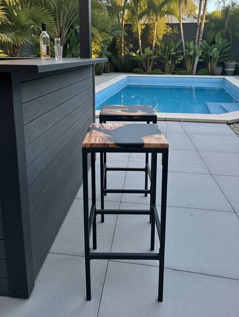 Le duo de tabourets « Onyx & Wood » est la définition même du mobilier industriel chic. L’assise carrée en chêne massif est travaillée avec des bords naturels (live edge) qui viennent s’imbriquer dans une résine époxy noire opaque d’une profondeur absolue.